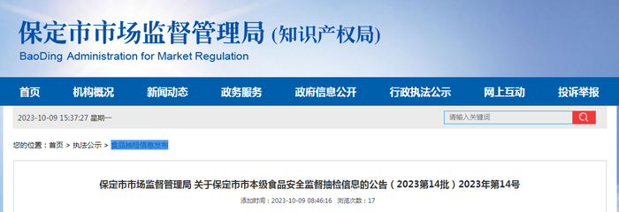 河北省保定市市场监管局发布市本级食品安全监督抽检信息(2023第14批)