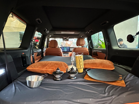 作为户外露营家庭车,极石01分为6座版和7座版,均为三排布局。它还拥有两处外放电接口,两处外放电最大功率可达2.2*2=4.4kw。
