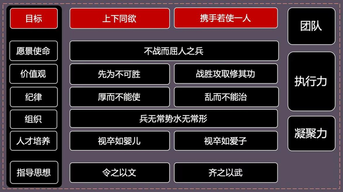 他认为,带领团队的指导思想是“令之以文,齐之以武”;对待人才要“视卒如婴儿”“视卒如爱子”;组织结构要如“兵无常势,水无常形”;纪律切忌“厚而不能使”“乱而不能治”,要赏罚分明;团队价值观是“先为不可胜”即先让自己不可被战胜,再想去战胜别人;愿景使命是“不战而屈人之兵”也就是“上兵伐谋”;再往上的团队最高目标“上下同欲”就是心往一处想,“携手若使一人”就是劲往一处使。