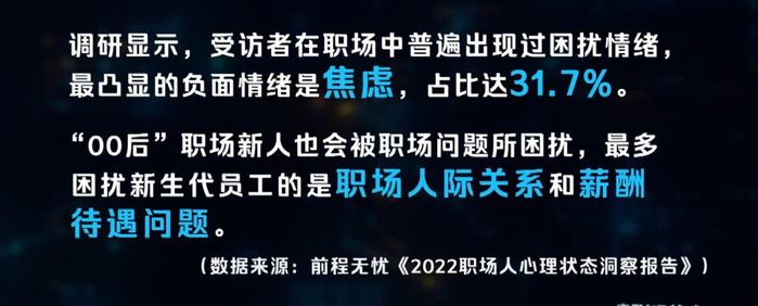 调研显示,受访者在职场中普遍出现过困扰情绪,最凸显的负面情绪是焦虑,占比达31.7%。“00后”职场新人也会被职场问题所困扰,最多困扰新生代员工的是职场人际关系和薪酬待遇问题。