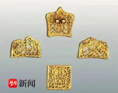 众多金器中,四片金珰最为显眼。一片为蝉纹,一片为方形兽面纹,两片为山形仙人骑龙纹。唐阎立本绘《历代帝王图》,现存美国波士顿美术馆,其中晋武帝司马炎冠冕上即绘有蝉形金珰。专家介绍,金珰在其他两晋十六国墓中也有发现,只有此墓和南京江宁东晋墓多达四片。“这是镂空金片缀以金珠或玉珠的冠饰,带有西域的工艺风格,汉晋以来装饰于帝王或公卿大夫的冠前,一如我们的帽徽,从古代帝王画像亦可得见。黄金永恒而高贵的色泽,让我们想起晋元帝的威仪,可能正是这些代表华夏正统文化的衣冠和徽章,征服了南方的士族。”南京大学高研院院长徐兴无说。