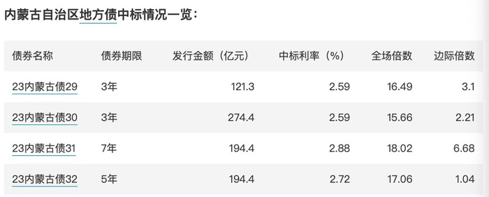 10月9日,内蒙古特殊再融资债(663.2亿,均为一般债,“23内蒙古债30”、“23内蒙古债31”、“23内蒙古债32”)已成功发行。其中“23内蒙古债29”用于偿还地方政府债券本金,属于普通再融资债券,其和特殊再融资债券“23内蒙古债30”的期限一致,二者的中标利率一致,全场倍数、边际倍数相差也不大。