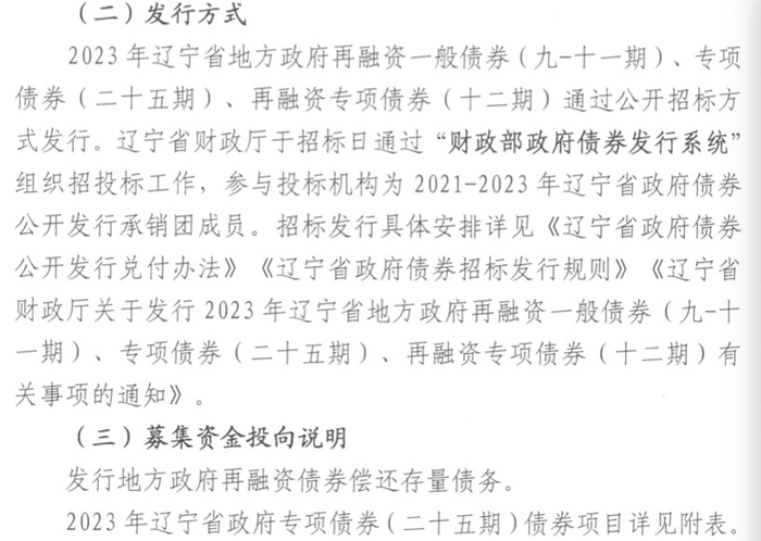 辽宁省此次披露的发债材料显示,辽宁省拟在10月12日发行辽宁省地方政府再融资一般债券(九-十一期)、再融资专项债券(十二期),规模分别为729.42亿、141亿。