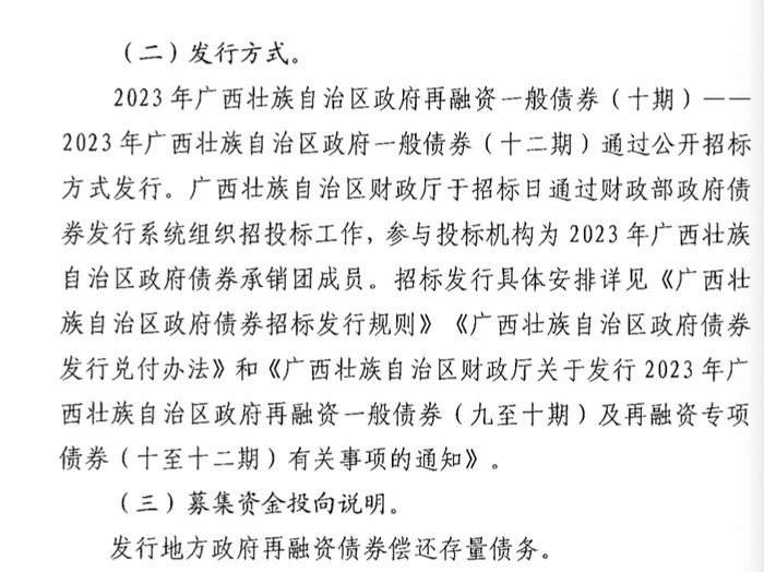 广西财政厅当日也披露,拟在10月16日发行再融资一般债券(十期)、再融资专项债券(十一至十二期),规模合计498亿。