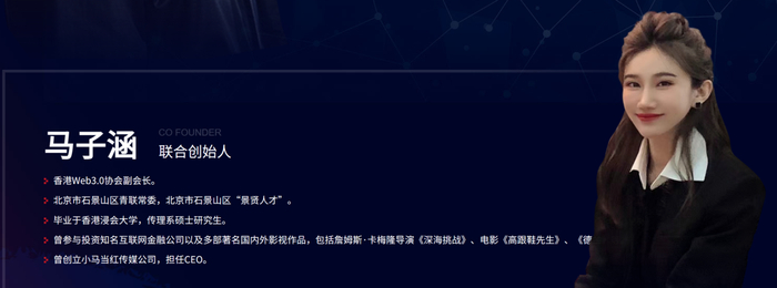 另一位联合创始人,马子涵,于1991年出生于广西壮族自治区柳州市,毕业于香港浸会大学,曾参与投资多部著名国内外影视作品,包括卡梅隆的《深海挑战》。现任当红齐天集团联合创始人、香港Web3.0协会副会长。