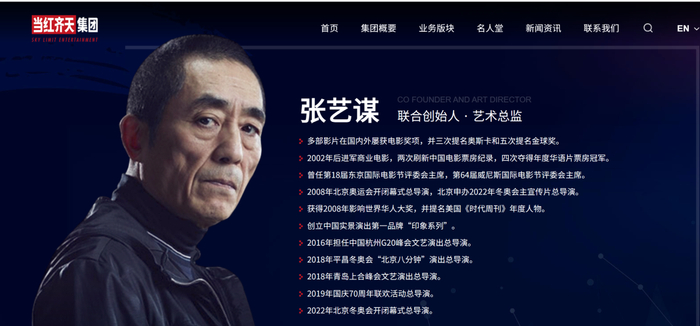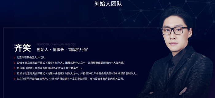三位创始人大有来头除了张艺谋之外,另外两位创始人齐笑和马子涵也大有来头。创始人兼董事长齐笑,曾受聘于北京2008奥运会组委会,2008年第29届 北京奥运会开幕式《画卷》制作人,闭幕式制作人之一 。2017年《财富》杂志评选中国40位40岁以下商界精英之一。