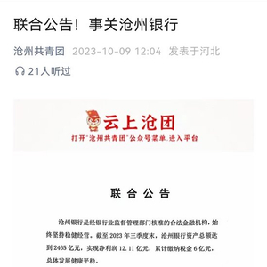 10月10日金融一线消息,“沧州共青团”公众号昨日发布一份署名为原沧州银保监分局盐山监管组、盐山县地方金融管理办公室、中国人民银行盐山县支行的联合公告。公告称,沧州银行是经国家金融监督管理总局核准的合法金融机构,始终坚持稳健经营。截至2023年三季度末,沧州银行资产总额达到2465亿元,实现净利润12.11亿元,累计缴纳税金6亿元,总体发展健康平稳。