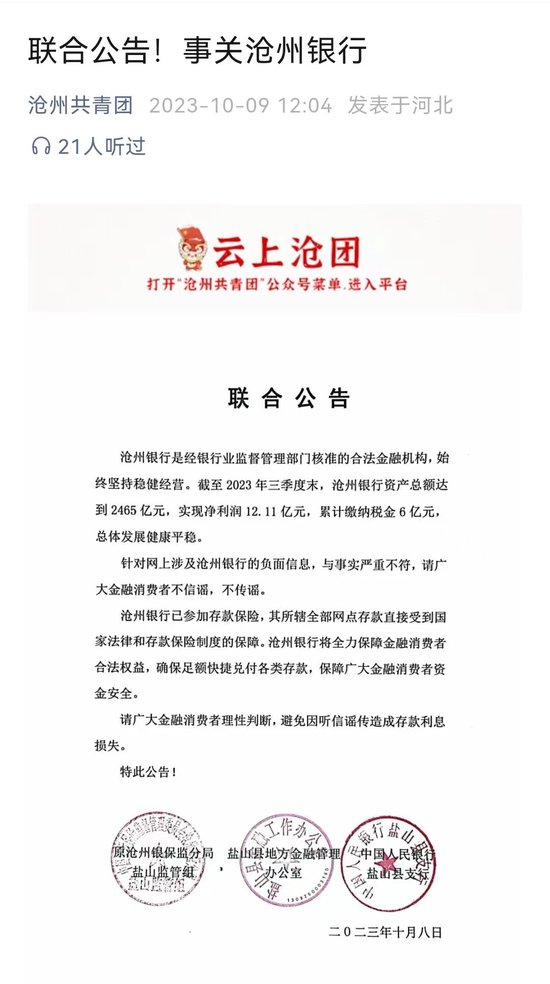 公告表示,针对网上涉及沧州银行的不实信息,与事实严重不符,请广大金融消费者不信谣,不传谣。沧州银行将全力保障金融消费者合法权益,确保足额快捷兑付各类存款,保障广大金融消费者资金安全。请广大金融消费者理性判断,避免因听信谣传造成存款利息损失。