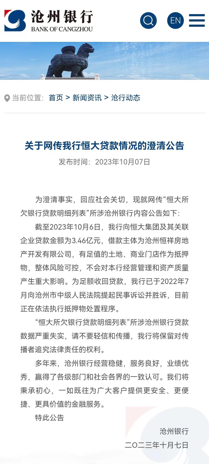 沧州银行10月7日发布公开声明称,截至2023年10月6日,我行向恒大集团及其关联企业贷款金额为3.46亿元,借款主体为沧州恒祥房地产开发有限公司,有足值的土地、商业门店作为抵押物,整体风险可控,不会对本行经营管理和资产质量产生重大影响。为足额收回贷款,我行已于2022年7月向沧州市中级人民法院提起民事诉讼并胜诉,目前正在依法执行抵押物处置程序。