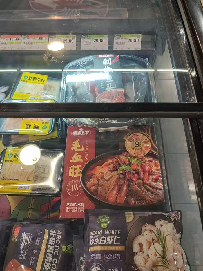 在一些冷藏柜里,记者看到了预制菜。比较家常的有糖醋里脊、水煮肉片、鱼香肉丝,也有较为复杂的,比如毛血旺、剁椒鱼头。另外,还有更高档的,写着“会所专用”的佛跳墙、花椒鸡。这些预制菜,定价从十几元到五六百元不等。
