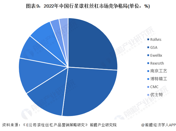 根据王有雪《E公司滚柱丝杠产品营销策略研究》的数据,2022年,国内行星滚柱丝杠市场主要被国外厂商占据,国外龙头制造商Rollvis、GSA和Ewellix的市场份额占比分别为26%、26%、14%;国内行星滚柱丝杠厂商合计市场份额占比为19%,其中以南京工艺、博特精工为代表,市场份额均为8%。
