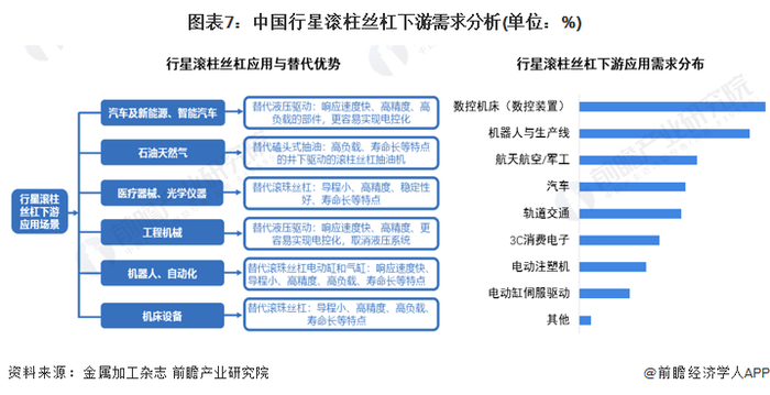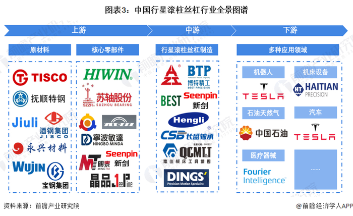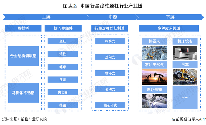 行星滚柱丝杠产业链由上游原材料与零部件供应、中游行星滚柱丝杠制造、下游多应用领域构成。在上游环节,行星滚柱丝杠中丝杠选用的材料多为合金结构钢,螺母和滚柱选用的材料为高碳铬轴承钢;零部件包括丝杠、螺母等关键部件。下游应用场景涵盖了多个行业,从汽车、石油天然气、医疗器械到光学仪器、工程机械、机器人、自动化和机床设备等。