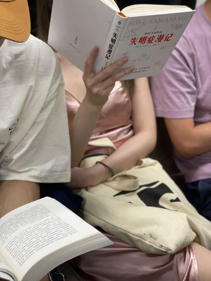 20230711。读书男女。在夜班地铁上,他们分别读《失明症漫记》和《在路上》。《在路上》公版后去年出了好几版,不是很确定是哪个版本,豆瓣评分就取了评分人数最多的版本。