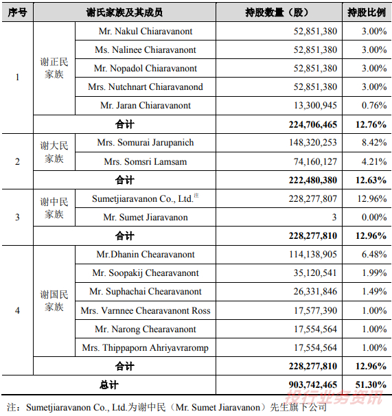 申报材料显示,正大畜牧投资持有发行人65%股权为发行人控股股东,泰国正大集团通过CPGOverseas等多层架构间接持有正大畜牧投资100%股权为发行人间接股东,谢正民、谢大民、谢中民及谢国民等四兄弟家族(以下简称谢氏家族)通过泰国正大集团间接持有发行人股份。