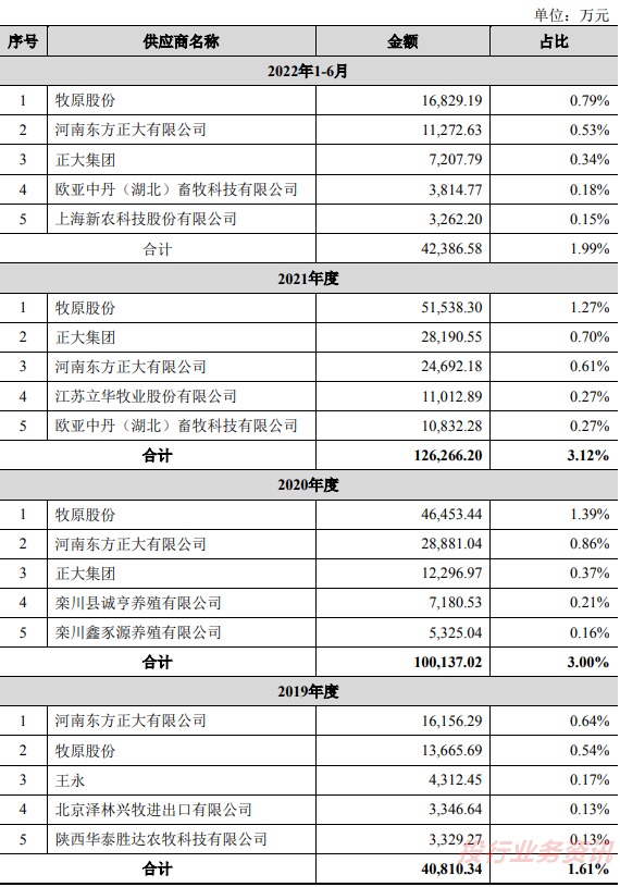 报告期内,公司生猪养殖及屠宰业务板块向前五名供应商采购的情况如下: