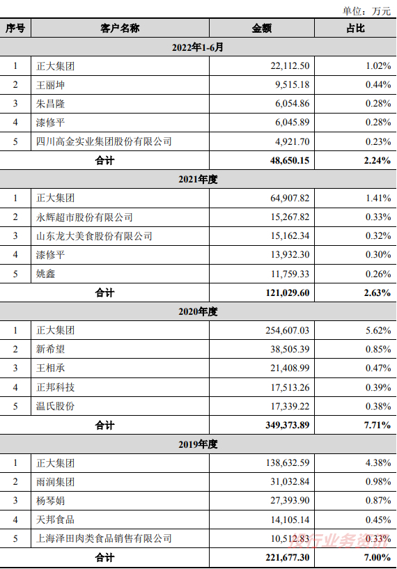 报告期内,公司生猪养殖及屠宰业务板块向前五名客户销售的情况如下: