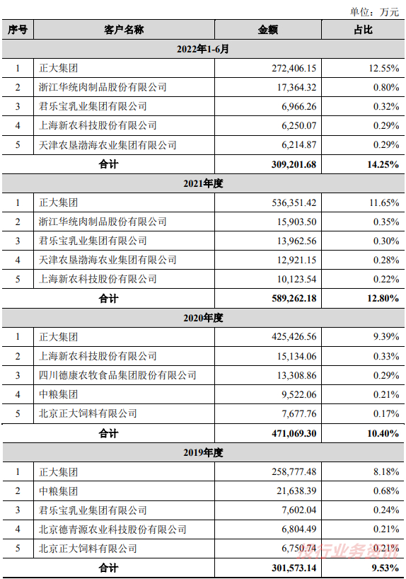 报告期内,公司饲料业务板块向前五名客户销售的情况如下: