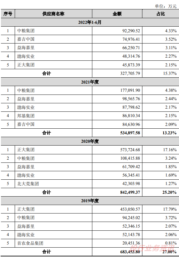 报告期内,公司饲料业务板块向前五名供应商采购的情况如下:
