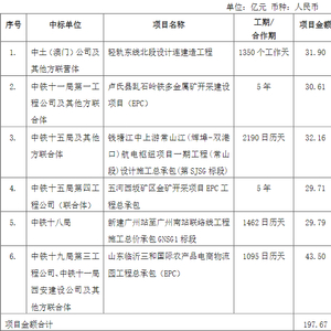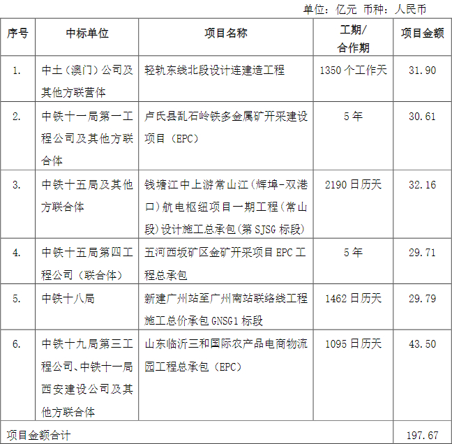 中国铁建:近期中标重大项目金额合计197.67亿元