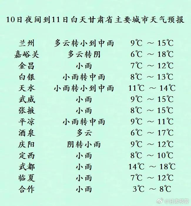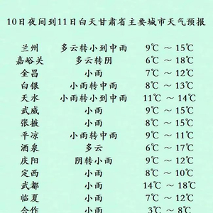 今天夜间到明天白天,甘南、临夏、陇南、天水、平凉等州市多云转阴有小雨,部分地方有中雨,其中甘南高原地区和临夏州南部山区局部地方有大雪;兰州、白银、定西、庆阳等市多云转阴有小雨,局部地方有中雨;张掖、金昌、武威三市多云转阴,部分地方有小雨,其中,张掖、武威两市南部山区部分地方有大雪;省内其余地方多云。另外,11日凌晨,庆阳市部分地方有雾。