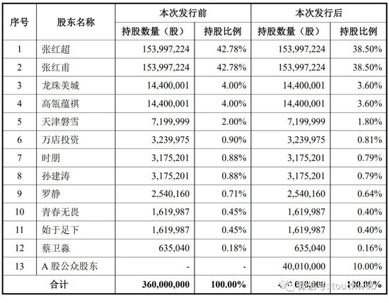 龙珠美城、高瓴蕴祺分别持股为4%,天津磐雪持股为2%,万店投资持股为0.9%,时朋、孙建涛分别持股为0.88%;