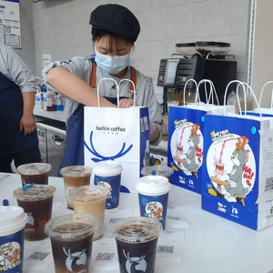 “现在买,起码要等半个小时以上才能取到。”柜台前,几名店员正忙着制作、打包、装袋,台面上放满了待取的饮品,顾客们围在台前等待,不少人都是冲着“猫和老鼠”联名来的。一名店员说,这两天联名款上线后,店内订单火爆,今天开门到现在,光是线下自提订单就已经有1000多单了,还不算线上的订单,限定款杯套也已经销售一空。