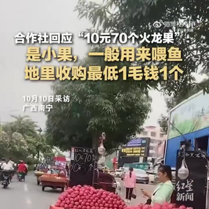 【#合作社回应10元70个火龙果#:是小果,一般用来喂鱼,地里收购最低1毛钱1个】#广西街头10元能买70个火龙果#10月10日,“南宁街头10元70个火龙果”的消息引发关注。有网友提出疑问,为什么当地火龙果那么实惠。种植火龙果的某合作社负责人告诉红星新闻,南宁是我国火龙果主要产区之一,近期是火龙果集中上市的季节。邓先生表示,新闻画面中10元70个的火龙果是毛果也叫小果,一般用来喂鱼。最小的毛果从农户地里收购,价格最低可到每个1角钱。邓先生表示,人们一般吃的是统果规格的火龙果,统果地里的收购价10元钱可以买15斤。