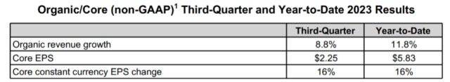 财报显示,第三季度有机销售额同比增长8.8%,预期为增长8.3%,非GAAP每股收益为2.25美元,市场预期为2.15美元,去年同期为1.97美元。