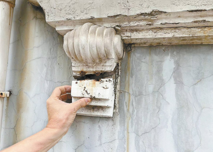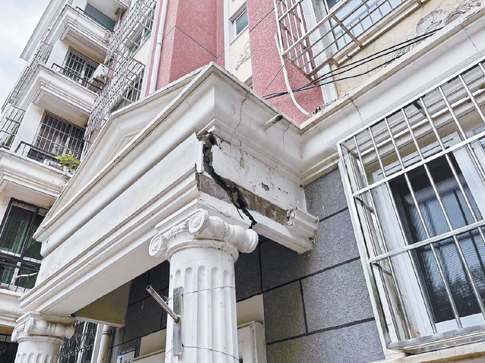 装饰物上掉落的砖块沉甸甸的,居民走在楼下提心吊胆。