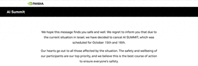 英伟达在活动网站上宣布:“我们遗憾地通知您,由于以色列目前的局势,我们决定取消AI峰会。我们对受到这种情况影响的所有人表示深切的同情。我们的参与者的安全和健康是我们的首要任务,我们相信这是确保每个人安全的最佳措施。”