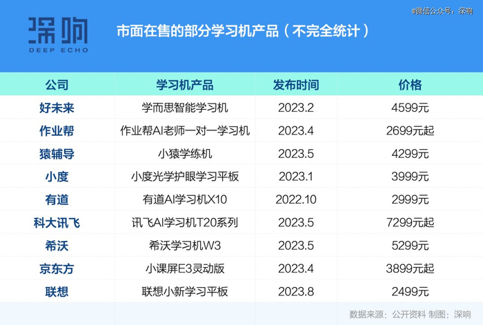 据「深响」不完全统计,仅仅在“学习机”这一品类上,目前就有好未来、作业帮、猿辅导、小度、有道、科大讯飞、希沃、读书郎、步步高、京东方艺云、联想等一众公司入局。它们背景各异,既有传统教育企业、在线教育阶段龙头,也有互联网企业、传统硬件公司。