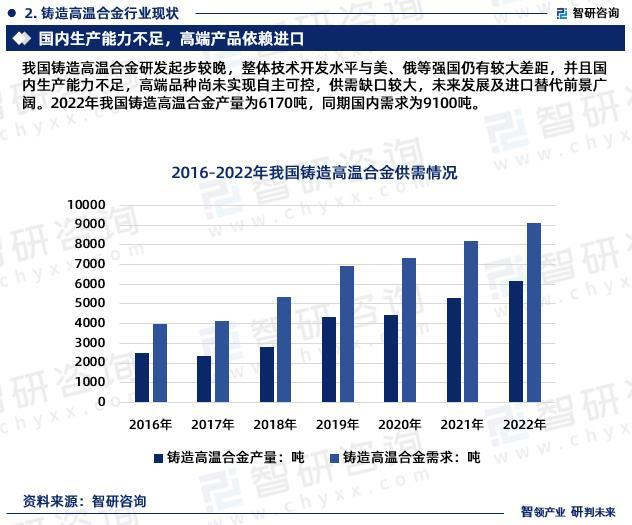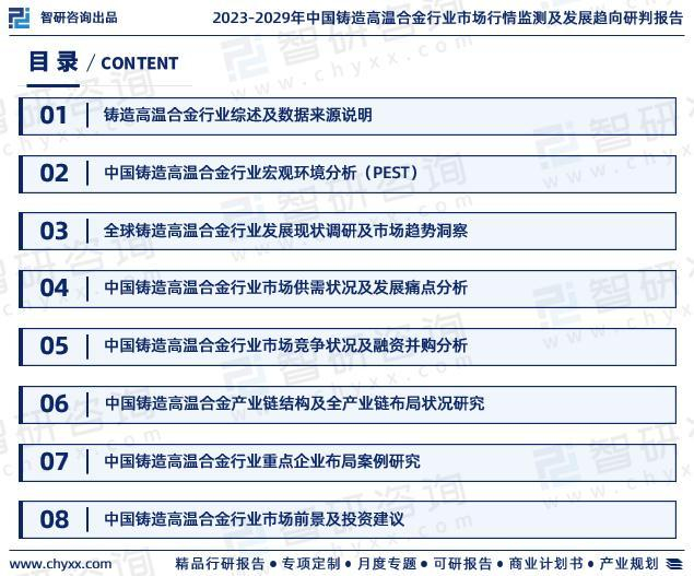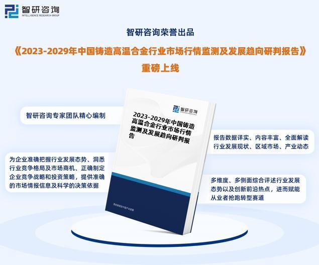 由智研咨询专家团队精心编制的《中国铸造高温合金行业市场行情监测及发展趋向研判报告》(以下简称《报告》)重磅发布,《报告》旨在从国家经济及产业发展的战略入手,分析铸造高温合金行业未来的市场走向,挖掘铸造高温合金行业的发展潜力,预测铸造高温合金行业的发展前景,助力铸造高温合金行业的高质量发展。