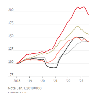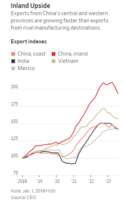 然后新闻里面附上了这个图片,从图片上看,以2018年1月为100的话,到2023年8月,即使是中国沿海地区的增长也和印度和墨西哥差不多,只是慢于越南,而中国内陆地区的出口增长速度则大大超过了印度,墨西哥和越南,而且出口规模上还更大。