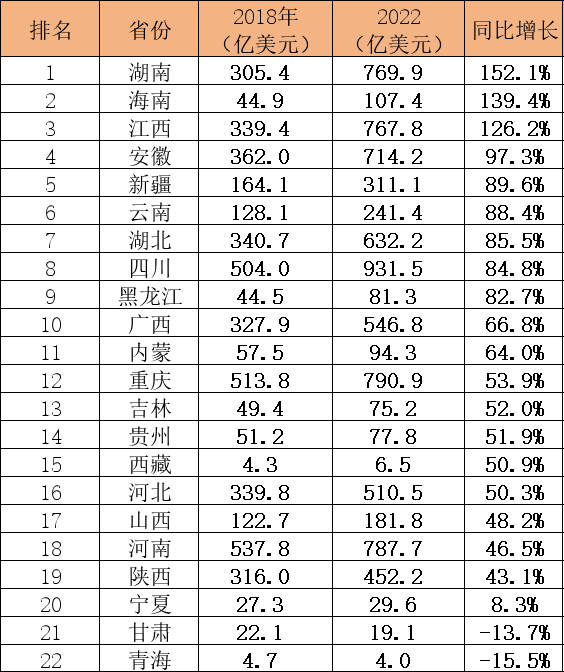 光是看总金额排名是不够的,我们还得看一下增长率的排名,这才能知道哪些省份在出口型制造业转移方面获得了更多。可以看出2022年相比2018年增长超过100%的有湖南,海南和江西三个省,当然了海南省基数小。其中湖南省是22个省份里面出口增速最高的,竟然达到了152.1%。