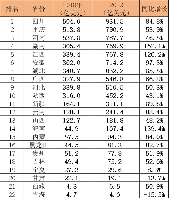 如果和越南同比比较,越南2018年出口为2447亿美元,2022年出口为3718亿美元,同比增长了51.9%,而在统计的22个省份里面,有14个省份的出口同比增长速度达到和超过了越南。