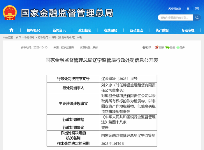 财联社10月11日讯(记者 彭科峰)10月10日,国家金融监督管理总局官网发布了两份锦银金融租赁有限责任公司(下称锦银金租)的行政处罚。