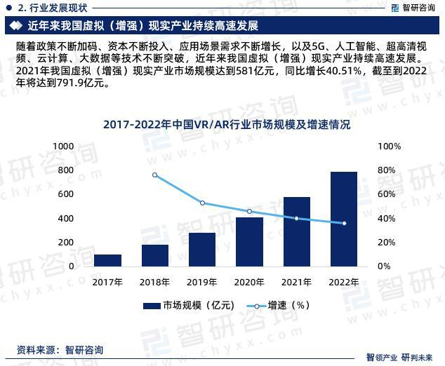 随着政策不断加码、资本不断投入、应用场景需求不断增长,以及5G、人工智能、超高清视频、云计算、大数据等技术不断突破,近年来我国虚拟(增强)现实产业持续高速发展。2021年我国虚拟(增强)现实产业市场规模达到581亿元,同比增长40.51%,截至到2022年将达到791.9亿元。