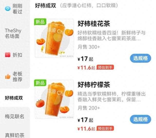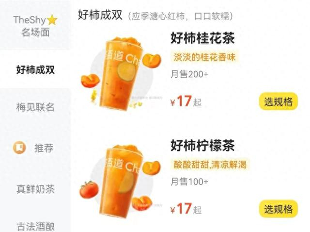 除此之外,记者还发现茶百道也上新了柿子口味的饮品,主打溏心口感的软糯柿子果肉,分别搭配桂花茶底和柠檬茶底,带来全然不同的香气体验。根据记者在不同外卖平台上搜索得到的数据,十月尚未过半,仅一家门店的“好柿”系列饮品销量就能达到近千杯。