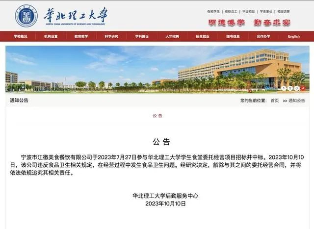 10月10日晚,华北理工大学后勤服务中心发出公告,称宁波市江徽美食餐饮有限公司于2023年7月27日参与华北理工大学学生食堂委托经营项目招标并中标。2023年10月10日,该公司违反食品卫生相关规定,在经营过程中发生食品卫生问题。经研究决定,解除与其之间的委托经营合同,并将依法依规追究其相关责任。