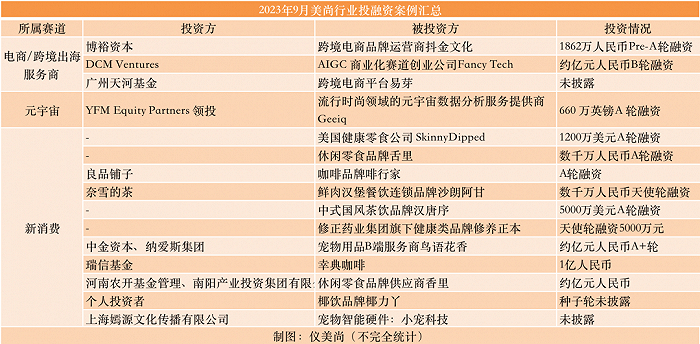 从美尚赛道整体来看,9月,消费品赛道热度最高,相关投融资事件达11起,而电商/跨境出海服务商相关投融资事件数量次之,为4起。