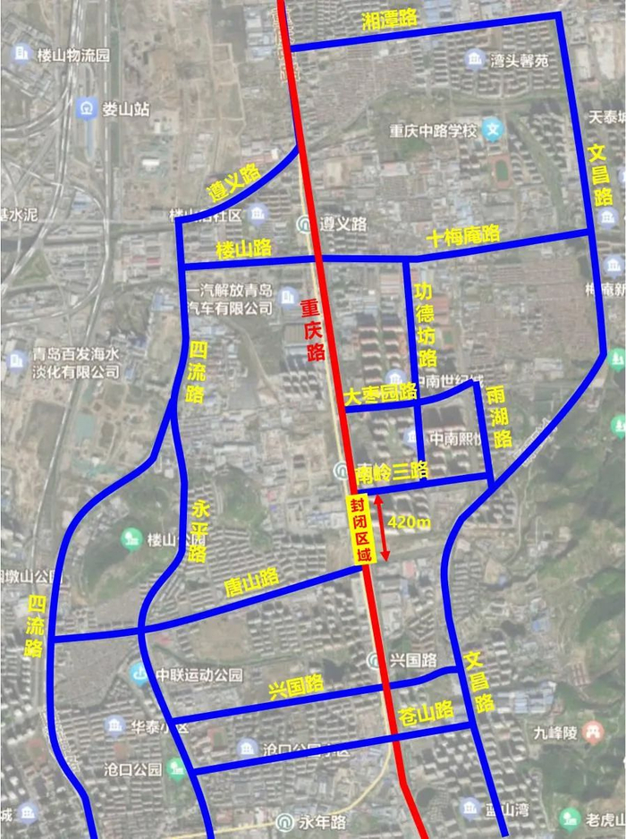 因《东岸产业园区基础设施综合改造项目》施工需要,自2023年10月15日至2023年10月29日,对重庆路(南岭三路至唐山路)路段进行全天封闭施工,共计15天。请途经车辆提前绕行,车辆绕行路线推荐如下: