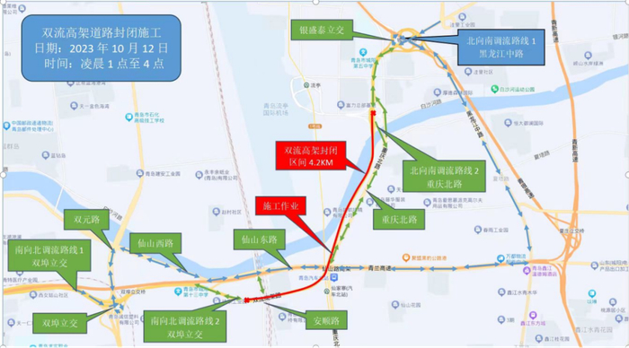 因重庆路跨双流高架钢箱梁吊装作业施工,将于2023年10月12日凌晨1时至4时对双流高架迎宾路至安顺路段双幅封闭施工。请过往车辆按以下调流路线绕行。