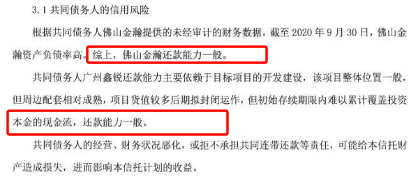 信托认购风险申明书上描述,根据共同债务人佛山金瀚提供的未经审计的财务数据,截至2020年9月30日,佛山金瀚资产负债率高,佛山金瀚还款能力一般。广州鑫锐还款能力主要依赖于目标项目的开发建设,该项目整体位置一般但周边配套相对成熟,项目货值较多后期拟封闭运作,但初始存续期限内难以累计覆盖投资本金的现金流,还款能力一般。