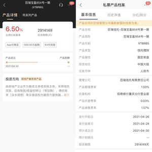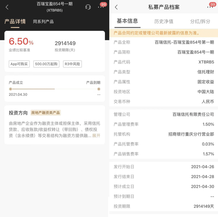 百瑞宝盈854号在2021年4月、5月各有一期募集成立,期限2年。存续规模在14亿元左右。当时,500万元起购利率为6.5%,100万元起购利率为6.3%。