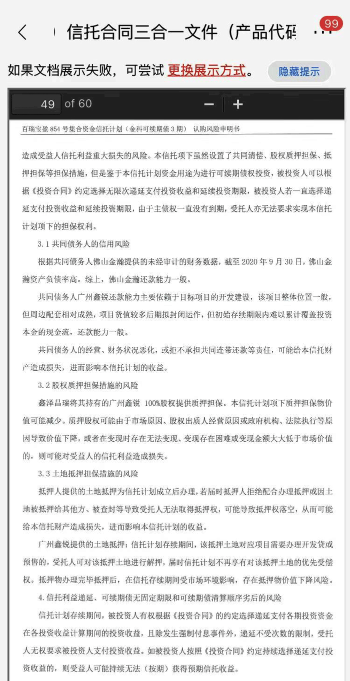 不过,信托认购风险申明书提到,佛山金瀚还款能力一般,广州鑫锐现金流、还款能力一般。