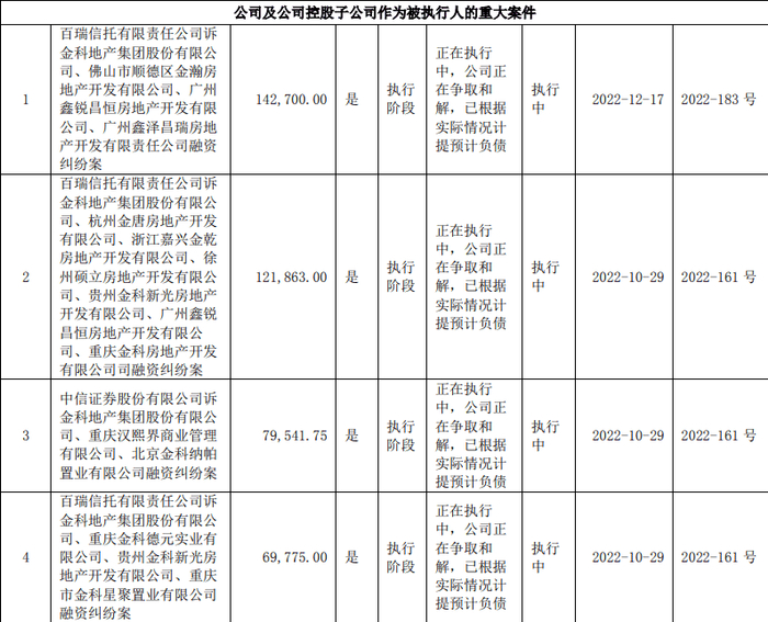 跟此次信托违约相关的案件是百瑞信托诉金科地产集团股份有限公司、佛山市顺德区金瀚房地产开发有限公司、广州鑫锐昌恒房地产开发有限公司、广州鑫泽昌瑞房地产开发有限责任公司融资纠纷案,涉案金额14.27亿元。诉讼案件目前处于执行中。金科地产表示,公司正在争取和解,已根据实际情况计提预计负债。