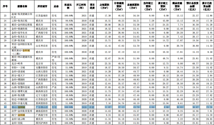 金科地产2023年半年报显示,佛山金科城2020年开建,占地面积11.87万平方米,总建筑面积45.78万平方米。预计总投资30.87亿元,累计已投资23.26亿元。