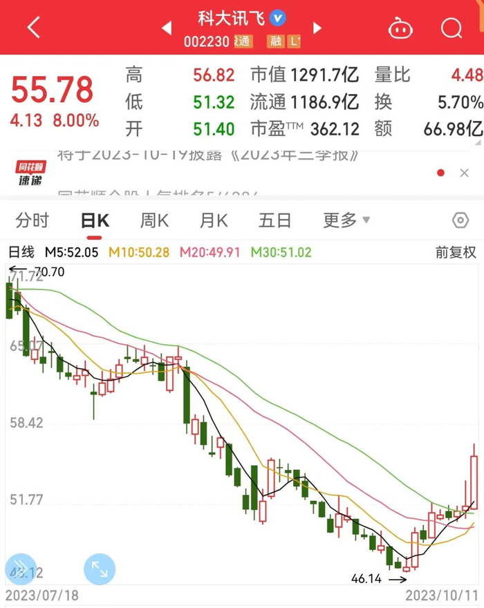 今天上午AI应用端盘中持续上行,其中教育、智能医疗等方向领涨,世纪天鸿、麦克奥迪20cm涨停,佳发教育大涨近17%,润达医疗2连板,科大讯飞大涨8%,盘中一度涨停。科大讯飞是AI龙头,总市值接近1300亿元。据悉,公司将于10月24日举行讯飞星火第四次发布会,在全球1024开发者节上,科大讯飞计划整体效果超过ChatGPT。
