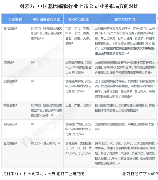 基因编辑行业上市公司业务布局方向对比