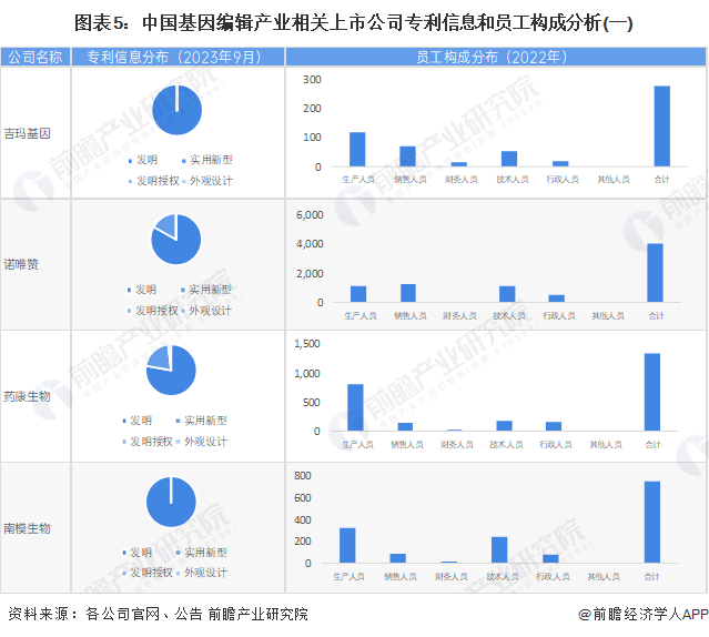 从上市公司的专利布局和员工构成方面来看,基因编辑行业相关上市公司的专利主要集中在实用新型专利,通常,行业中游公司以及CRO公司的实用新型专利占比可达到75%以上。从员工构成方面来看,生产人员、技术人员是人员构成的两大主力,其中,行业中游公司生产人员占比略高于技术人员,而CRO企业的技术人员是占比最多的。